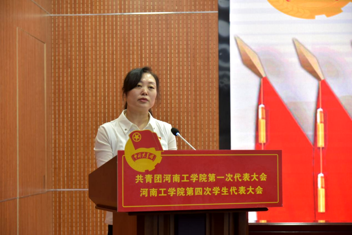 团省委学校部部长刘淑丽代表共青团河南省委对大会的召开表示热烈祝贺,高度评价了学校共青团、学生会组织在思想引领、组织建设、服务青年等方面取得的突出成绩,并对今后一段时期学校团学工作提出要求:一是坚持为党育人,不忘初心使命。抓好组织育人基础,突出实践育人特色,发挥网络育人优势,在青年学生思想引领中发挥主力军作用。二是心系广大青年,牢记政治责任。深入学生拉近距离,解决学生急难愁盼,促进学生人生出彩,成为广大青年信得过、靠得住、离不开的贴心人。三是锐意改革创新,加强自身建设。要持续深化共青团改革,深入推动学生会改革,不断加强团学组织作风建设,把学校团学组织建设得更加充满活力、更加坚强有力。她希望河工青年在习近平新时代中国特色社会主义思想的引领下,在校党委和上级团组织的正确领导下,坚定不移听党话、跟党走,为新时代中原更加出彩和学校建设高水平应用型大学汇聚更加磅礴的青春力量,以优异成绩迎接团的十九大胜利召开!