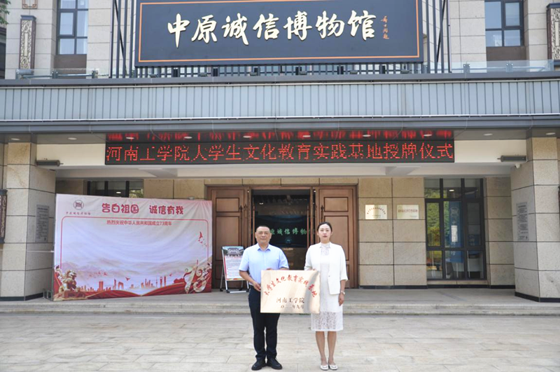 9月29日,我校“大学生文化教育实践基地”授牌仪式在中原诚信博物馆成功举行。该实践基地的建立,为我校大学生搭建了深入理解诚信、践行诚信,发扬光大诚信文化的实践平台。河南工学院原马克思主义学院院长王玉萍、校团委书记郭宇及诚城社区党委副书记、中原诚信博物馆执行馆长孔庆国,诚城集团党委副书记张永利等参加了授牌仪式。
