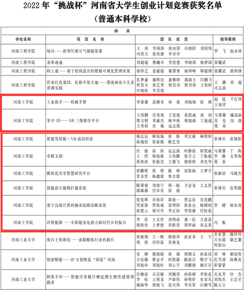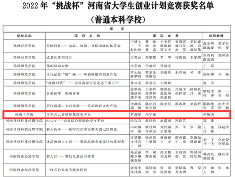 近日,由共青团河南省委、河南省教育厅、河南省人力资源和社会保障厅、河南省科学技术协会、河南省学生联合会共同主办的2022年“挑战杯”河南省大学生创业计划竞赛活动落下帷幕。本次活动中我校取得了银奖一项、铜奖八项的优异成绩。