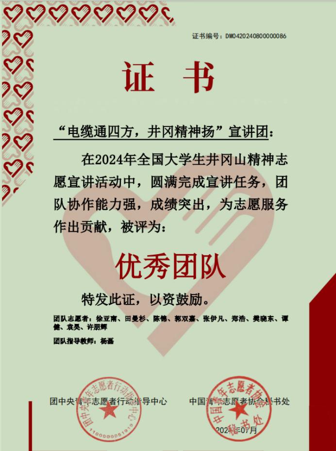 近日,团中央青年志愿者行动指导中心、中国青年志愿者协会公布了2024年全国大学生井冈山精神志愿宣讲团优秀团队名单,我校电缆工程学院“电缆通四方 井冈精神扬”志愿服务队从全国1000支队伍中脱颖而出,被评为全国优秀团队。