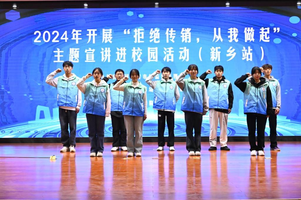 白玲在讲话中对全省打击传销工作基本情况做了简要说明,提出三点希望,一是加强宣传教育,筑牢思想防线;二是完善防控机制,强化源头治理打击传销;三是发挥榜样力量,弘扬正能量,共同抵制传销,营造良好的社会氛围。学生代表王泽秋带领现场的学生们一起宣读倡议书。