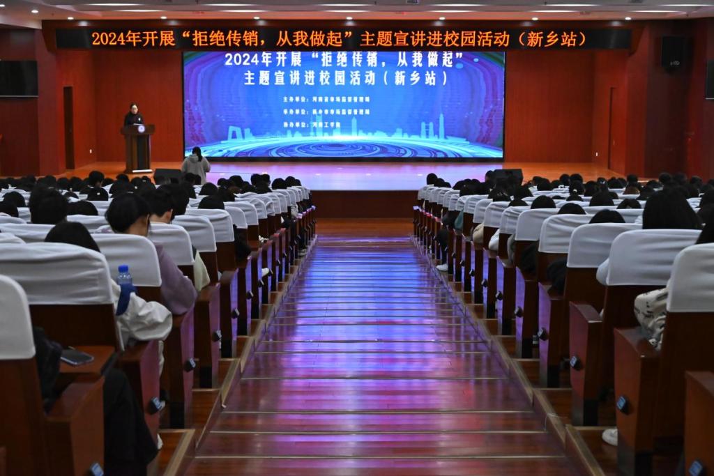 11月5日,“拒绝传销 从我做起”主题宣讲进校园活动(新乡站)在我校成功举办。此次活动是由河南省市场监督管理局主办,新乡市市场监督管理局、河南工学院承办,活动旨在普及宣传打击传销相关法律法规知识,提高大学生对传销的识别分辨能力,增强安全防范意识,共同营造平安校园。省局反不正当竞争处三级调研员白玲、市局副局长穆纪胜、河南工学院副校长郭祖华等出席活动并作了重要讲话。
