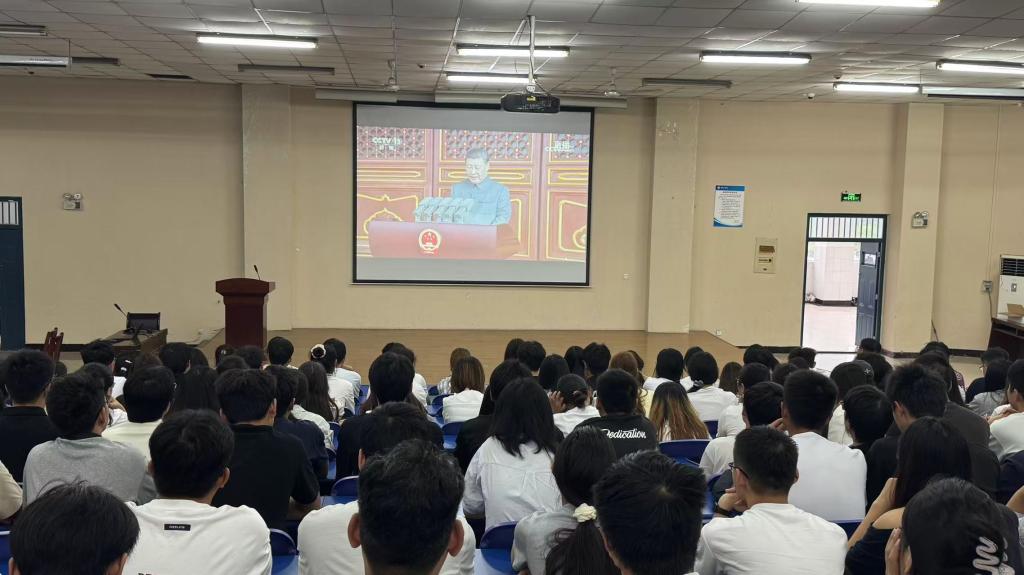 活动现场,同学们早早到报告厅,怀着激动的心情等待仪式开始。直播过程中,同学们全程专注,认真聆听重要讲话,深刻领会抗日战争胜利的重大历史意义与深远时代价值。当阅兵式环节展开,看着屏幕上整齐划一的受阅方阵和各类先进武器装备,现场掌声与赞叹声此起彼伏,师生们的自豪之情油然而生,会场不时响起热烈掌声。