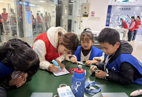 活动启动后,志愿者借助迎宾机器人引导小学生进入学院实验室,科普机器人的构造原理与应用场景。在实验室,老师给小学生们讲解着现代工业自动化技术的实际应用,学生们现场学习了3D打印技术并参观了刹车片生产线。在观看了机器人表演之后,孩子们对机器人灵活智能的表现惊叹不已,跳舞机器人随音乐展现流畅舞姿,收获了现场师生的热烈掌声。随后,学院为小朋友们发放3D打印笔,在志愿者们的指导下,孩子们亲自动手通过3D打印笔打印出来了许多作品,体验了3D打印技术的乐趣。通过互动体验,孩子们不仅学习了机器人基础知识和3D打印技术知识,还培养了团队协作和解决问题的能力。