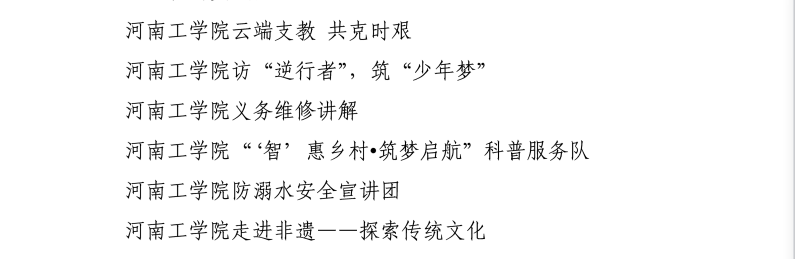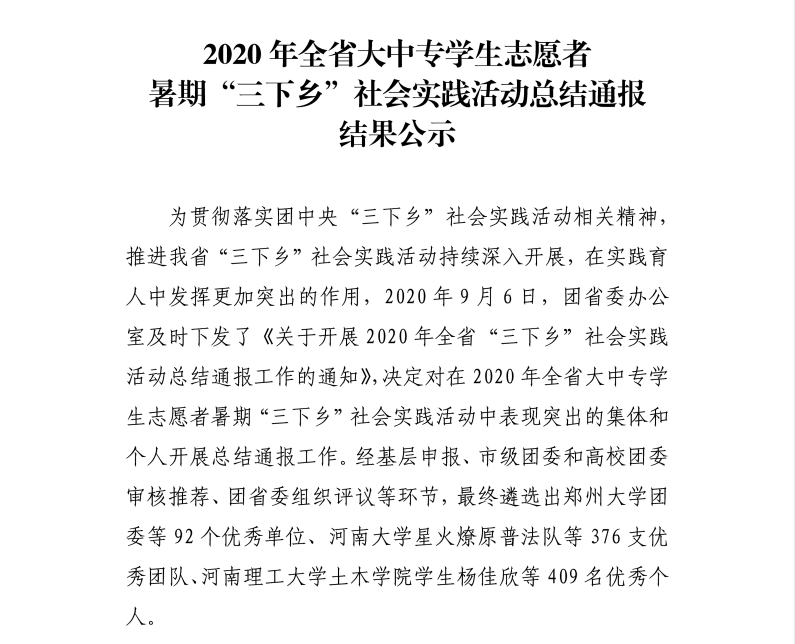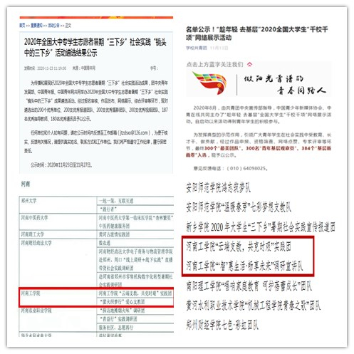 近日, 团省委对2020年河南省大中专学生志愿者暑期文化科技卫生“三下乡”社会实践活动进行了集中表彰,我校艺术设计学院团总支获评省级社会实践活动优秀单位,6支实践团队获评省级优秀服务队,6名同学获评社会实践先进个人。此外,在团中央2020年全国大中专学生志愿者暑期“三下乡”社会实践活动总结表彰中,我校2支实践团队荣获“千校千项”成果遴选优秀团队称号,2名学生获评优秀实践者;5支实践团队在“镜头下的三下乡”实践活动成果展示中荣获6项表彰,8位师生受到个人表彰。