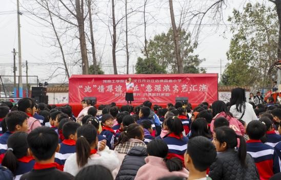 本次活动包含科普宣传、文艺汇演、志愿服务以及物品捐赠等环节。电缆工程学院与电子信息工程学院师生从专业角度出发,发挥自身专业优势,分别开展 “科技强国,奋斗有我”科普宣传活动与家电维修服务活动。艺术设计学院结合专业特色为晏庙小学的外墙带来了一层色彩,开展墙绘志愿服务。河南工学院大学生艺术团围绕乡村文化建设,精心准备文艺节目,为当地群众和学生带来一场生动精彩的文艺汇演,展现了河南工学院当代大学生青春活力的精神面貌。活动期间,戚新波同志代表河南工学院向沈丘县刘庄店晏庙小学捐赠音响、体育用品等。
