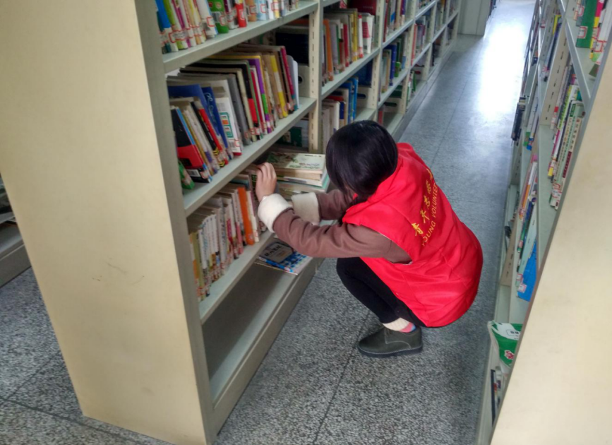 早上八点半志愿者们便来到了新乡市图书馆,今天是这个长期活动在2017年的第一次进行,志愿者都表现的比较兴奋。他们在申主任的安排下将图书按编号分类,成套图书归类,然后完成了图书上架的工作,在活动中申主任不时的慰问给予了志愿者更大的工作动力。由于书架分为四层,志愿者们总是在重复蹲下和站起来这两个动作。身材较高的志愿者稍好一些,较低的在整理高层的书是却总需要踮起自己的脚尖,不一会志愿者们的额头上都布满了汗水,但当他们看到自己整理的整整齐齐的书籍和读者们赞许的目光时,志愿者们觉得他们的一上午的辛苦是值得的!他们可以自豪的说“我是一名志愿者!”