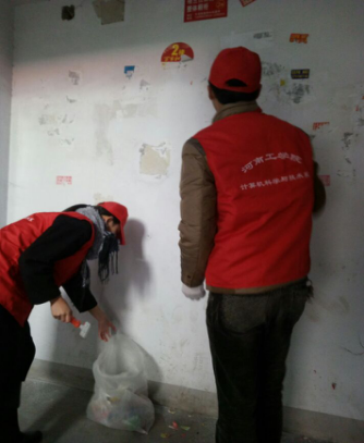 26日上午7点在天桥下集合完毕,在校青协和计科系青协分会的共同带领下,志愿者们安全到达服务地点。志愿者们八人分成一小组,每队一个干事作为负责人。小区工作人员分发清洁工具安排打扫区域,一切工作分配完毕后,各队陆续到达自己所划分区域。由于墙壁上面粘贴了各种小广告而且位置都比较高男生们都主动让自己队伍中的女生去打扫道路两旁与草坪中的生活垃圾,自己则拿清洁工具清理墙壁上的各式广告贴纸,墙壁上有些广告纸可能是胶水凝固比较好,使得清洁异常困难,但是在大家的共同配合下工作仍然顺利完成。