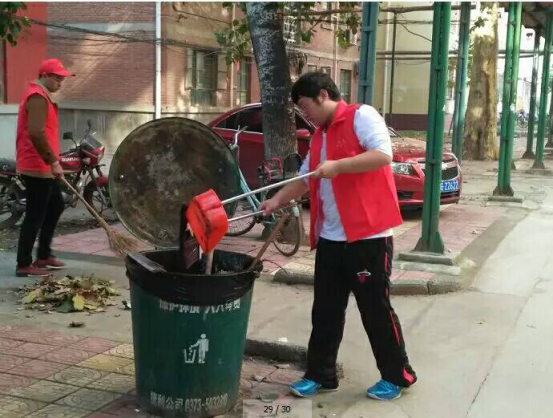 志愿者们到达指定地点,在认真听取社区负责人分配的打扫任务后,志愿者们开始清理小区路面和楼道各个角落里的垃圾。活动过程中,漫天飘零的树叶给志愿者们的行动带来了阻碍,但这一点并不能影响志愿者们清洁街道的脚步。为了避免树叶乱飞,志愿者们有条不紊的一边清理树叶一边将其放入垃圾桶内;遇到墙壁上的小广告,志愿者巧妙地使用铲刀,在确保不刮伤墙壁的前提下,耐心清理,难以刮除的小广告便用指甲处理;遇到难以清理的垃圾死角和高楼道里的垃圾,志愿者们更是积极踊跃,干劲十足。经过一上午的辛勤劳动,志愿者们为社区进行了一次彻底的大扫除。尽心尽力完成清洁工作的志愿者们虽然手指、手背到处都是垃圾残留的污渍,但看着社区环境在自己的手下变得洁白如新,纷纷露出了洋溢着成就感的微笑。