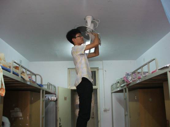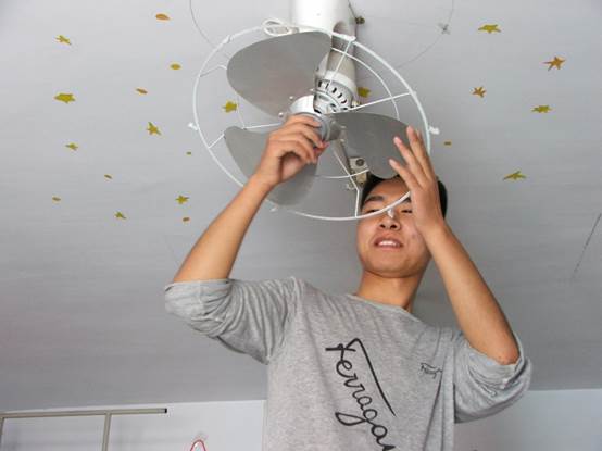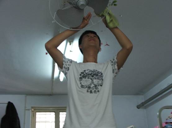 进入女生宿舍后志愿者认真的擦拭布满尘土的风扇