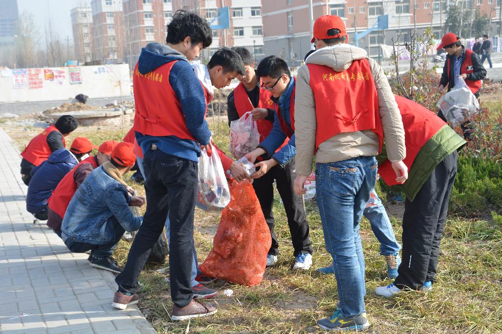 三十几名青年志愿者,身着红色志愿者马甲,手拿清理工具,捡拾果皮、纸屑,清理路旁的杂草,志愿者们分工明确、细心的清理,不放过任何死角,早上起来跑步的同学也加入了志愿者的队伍中。三五个志愿者拿着塑料沿着学子湖,捡拾同学们不经意丢掉的垃圾。这边四五个志愿者一起把路边沟壑的垃圾全部清了出来。那边的两个同学推着推车,把志愿者们放到路旁的垃圾都拉走。经过志愿者和同学们的共同努力下,校园焕然一新。