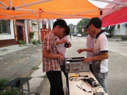 在系团总支的安排下,我系大学生暑期社会实践活动拉开帷幕,此次学生暑期社会实践分两种形式,团总支组织集中实践服务团;其他同学由团总支开具介绍信,通过自主实践的形式开展。7月5日,在系团总支李云飞老师带领下,我系8名同学组成的“计算机免费维护服务团”首站到公村开展电脑免费维护活动。社会实践旨在鼓励青年学生把创新思维与社会实践紧密结合起来,积极投身实践活动,不断提高实践能力、创新创业能力,增强社会使命感和责任感。此次活动受到了公村广大村民的好评。后续服务团将陆续到“八一小区”、“逸品紫晶”小区等居民小区开展电脑免费维护活动。