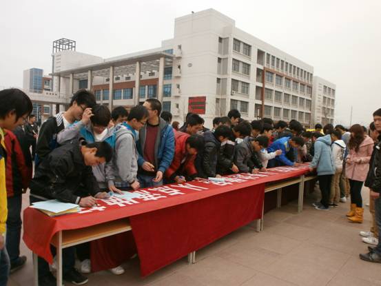 活动期间,后勤处和校团委通过宣传展板和举办签名活动,普及节水节电知识,广泛宣传节水节电的理念。作为活动周的内容之一,“节约保护资源,大力建设生态文明”的签名活动于3月29日下午在我校新校区人文广场举行。在志愿者们的组织下,同学们在一条8米长的“节约 环保 从你我做起 从身边做起 从点滴做起”条幅上签上了自己的名字。同时,志愿者们还向同学们发放了节水节电小窍门的宣传页。