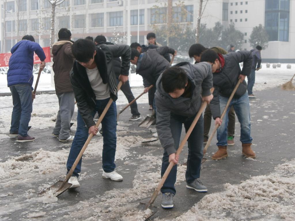 昨日起,我市迎来强降雪的天气,大雪纷纷扬扬下了近10个小时。今天早上积雪造成路面结冰,给我校师生的出行带来了不便与潜在的危险。为此,校团委发动全校的青年志愿者和学生干部,带头开展“扫除积雪方便他人”的义务扫雪活动,并得到积极的响应和落实。严寒挡不住志愿者的热情,哪里有需要哪里就有志愿者的身影。扫雪时志愿者们握着铁锹,哈着白气,一铲一铲的把冰撬开,移出路的中央,努力清扫出安全通道。虽然气温已在零度以下,但大家却干的热火朝天,有的铲、有的推,场面十分热闹,一会儿功夫便成果显著。在此气氛的感染下,不少刚下课的老师同学也纷纷加入到扫雪的队伍中来,整个校园呈现出一派热火朝天的扫雪场面。通过大家的齐心协力、共同奋战,经过近两个小时的努力,积雪基本终于清理完毕,新老校区内各个楼门前及主路都可安全通过,为师生的出行提供了极大方便。