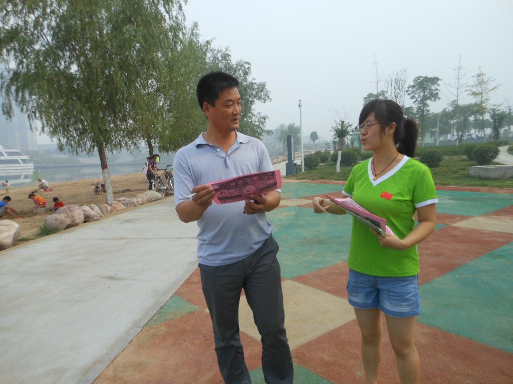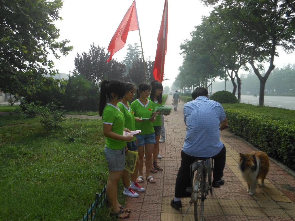 2012年7月1日,我校外语系“大学生环保志愿服务团”的同学们为了服务和谐社会建设,践行社会主义荣辱观,提高思想政治素质,进行了为期五天的宣传环保知识、保护地球母亲的社会实践活动。