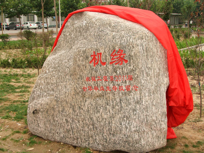 机械工程系毕业生文明离校工作每年都紧抓不放。方式除了传统的合影留念、座谈会之外,还有属于自己特色的一些方式。2008届毕业生离校时每个班都为母校留下一棵“感恩树”,表达心中的眷恋之情,也祝福母校桃李芬芳。当年这些贞子树种在了综合楼前,后随校搬迁至实字6#楼西南角,三年过去了,小树郁郁葱葱,枝叶茂盛,象征着毕业生对母校的深情绵延不断和母校发展的欣欣向荣。今年,2011届毕业生,又用刻石留念的方式表达自己对母校的感恩之情。刻石立在了实字6#楼前东南侧,为大理石,高2.008米,宽2.011米,厚0.55米,寓意自己在校的三年,无时无刻不忘母校之恩;上刻“机缘”二字,本意为机会和缘分,在此亦寓意机专人之缘,机械人之缘,也恰好应了机械工程系系刊之名;石头整体造型为竖琴形,寓指同学们心存乐音,将来定能奏出和谐美妙的人生乐章。