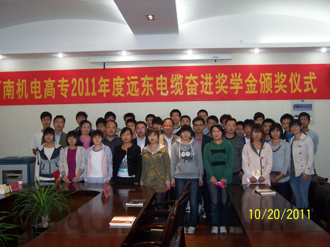 “远东电缆”奋进奖学金是我校和远东控股集团经协商在我校电缆专业和电缆行业相关专业设置的奖学金,今年为第六次发放,本次共有34名同学获奖,各位领导为获奖同学颁发了荣誉证书和奖金,对获奖同学表示了祝贺,并鼓励其他同学向他们学习,希望同学们好好学习,积极进取,以优异的成绩回报远东电缆公司,回报社会。