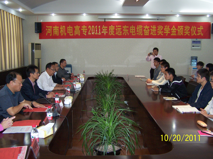 2011年10月20日下午3点,我校2011年度“远东电缆”奋进奖学金颁发仪式在实字2号楼105会议室举行,远东控股集团人力资源部程传奇总监、贾兴涛部长代表企业出席了本次奖学金颁发仪式,我校副校长王学让、招生就业办副主任侯存敏、产学联络处副处长景秀琴、电气工程系主任戚新波、系党总支书记王绪其参加了颁发仪式。